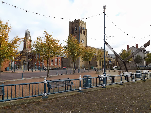 Armentieres Square with the old Market Hall on the left, Holy Trinity and Christchurch in the centre and the Alan Dawes sculpture that was erected in 2008.