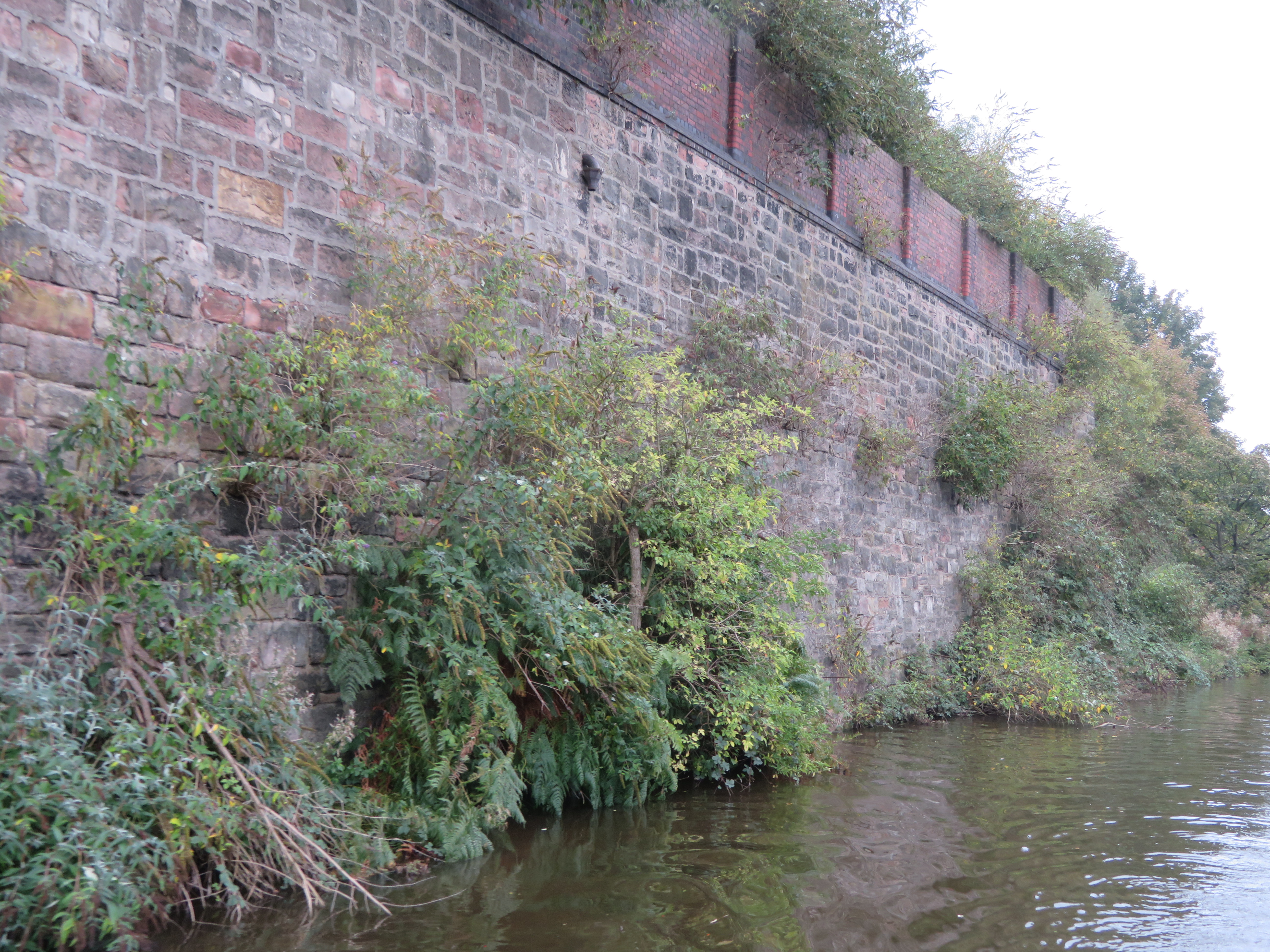 I think if there is a contender as a rival to the Great Wall of Todmorden it is here as we pass the old entrance of the Newcastle Canal alongside the A500. This part is the original stone part but there are modern bits with different bricks. In parts it is up to 15m high. It is a shame that it isn't made more off. Maybe it should have the shrubs etc cleared of anyway.